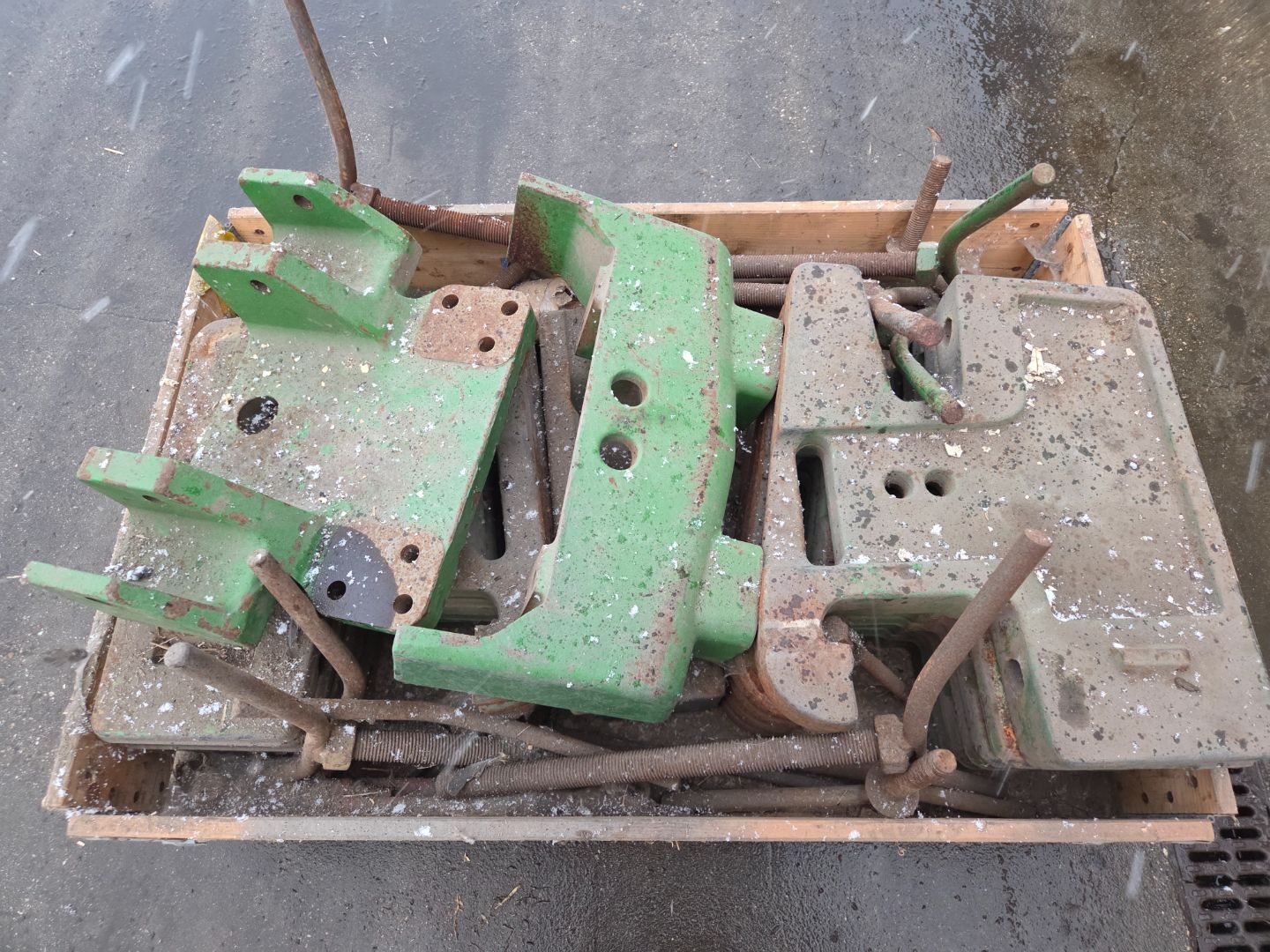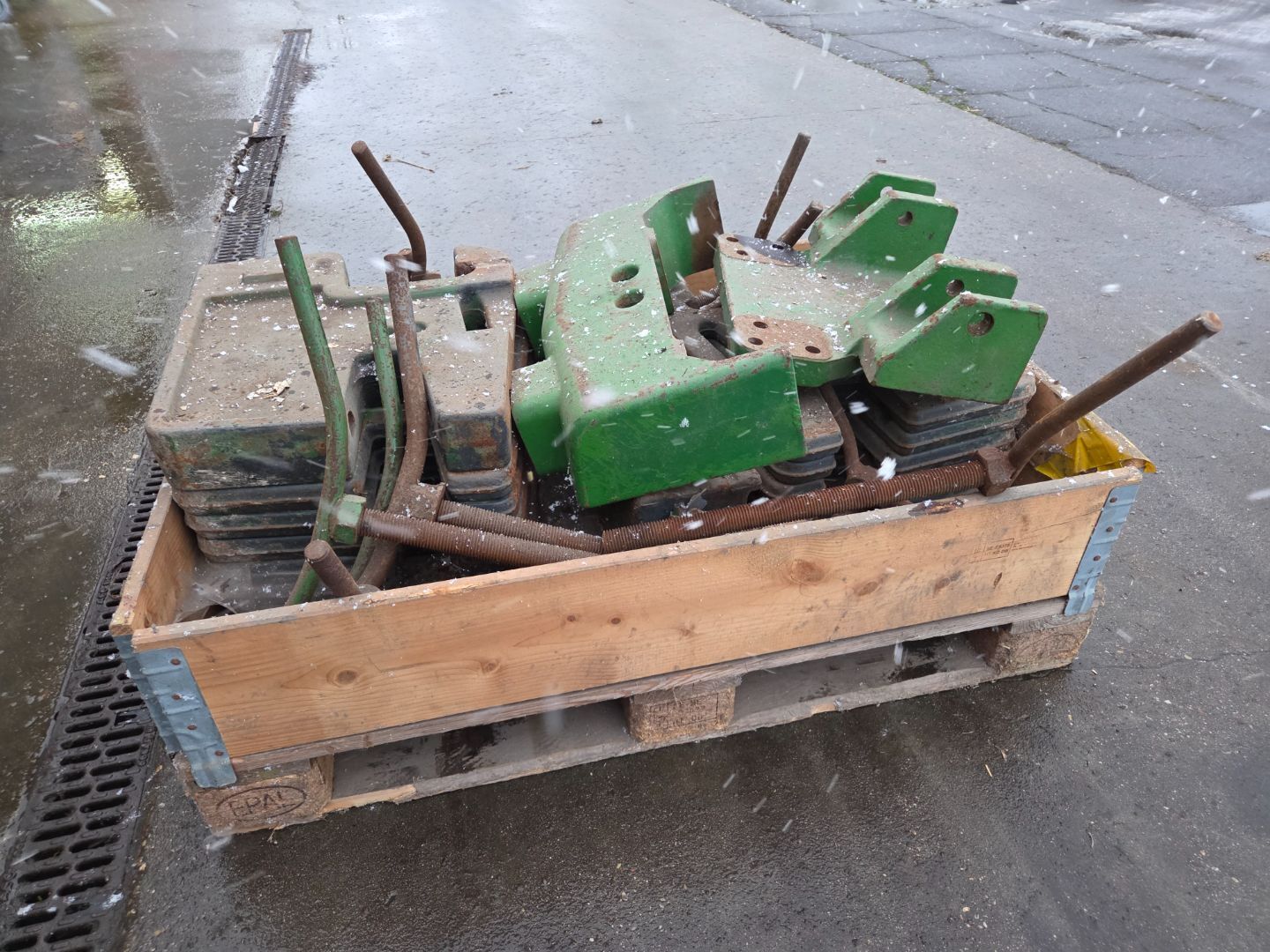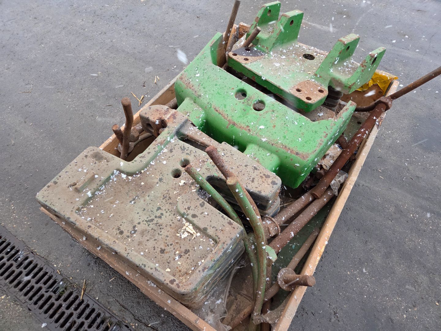| Beschrijving: | Pallet met John Deere gewichten + spindels en "moederblokken" etc |