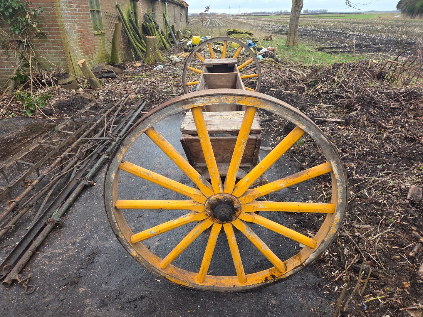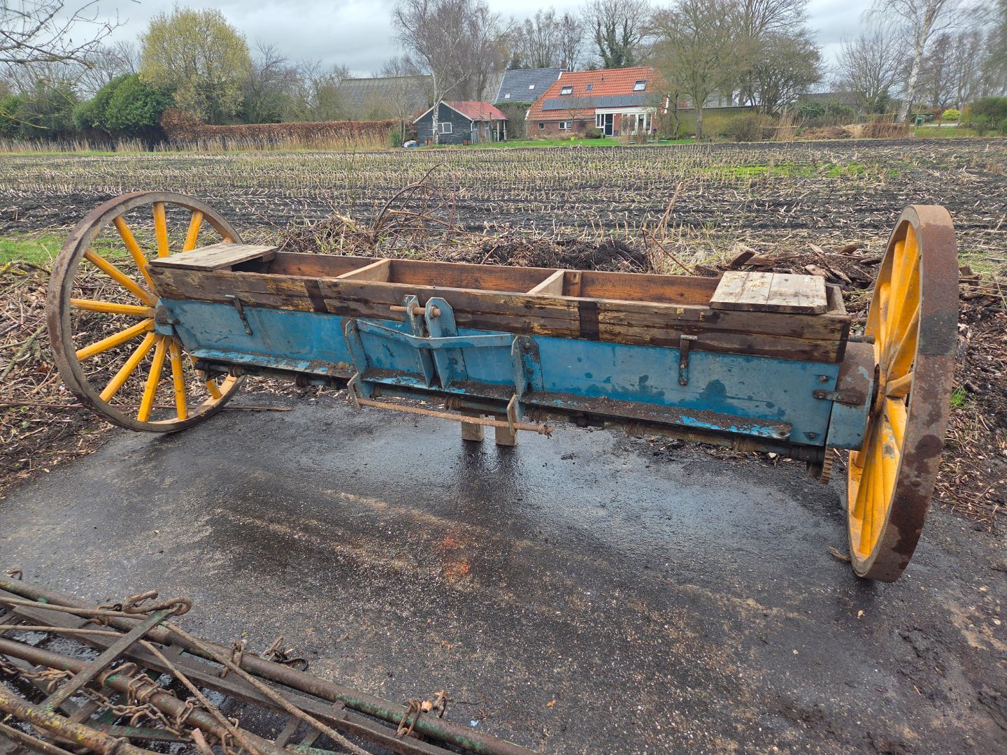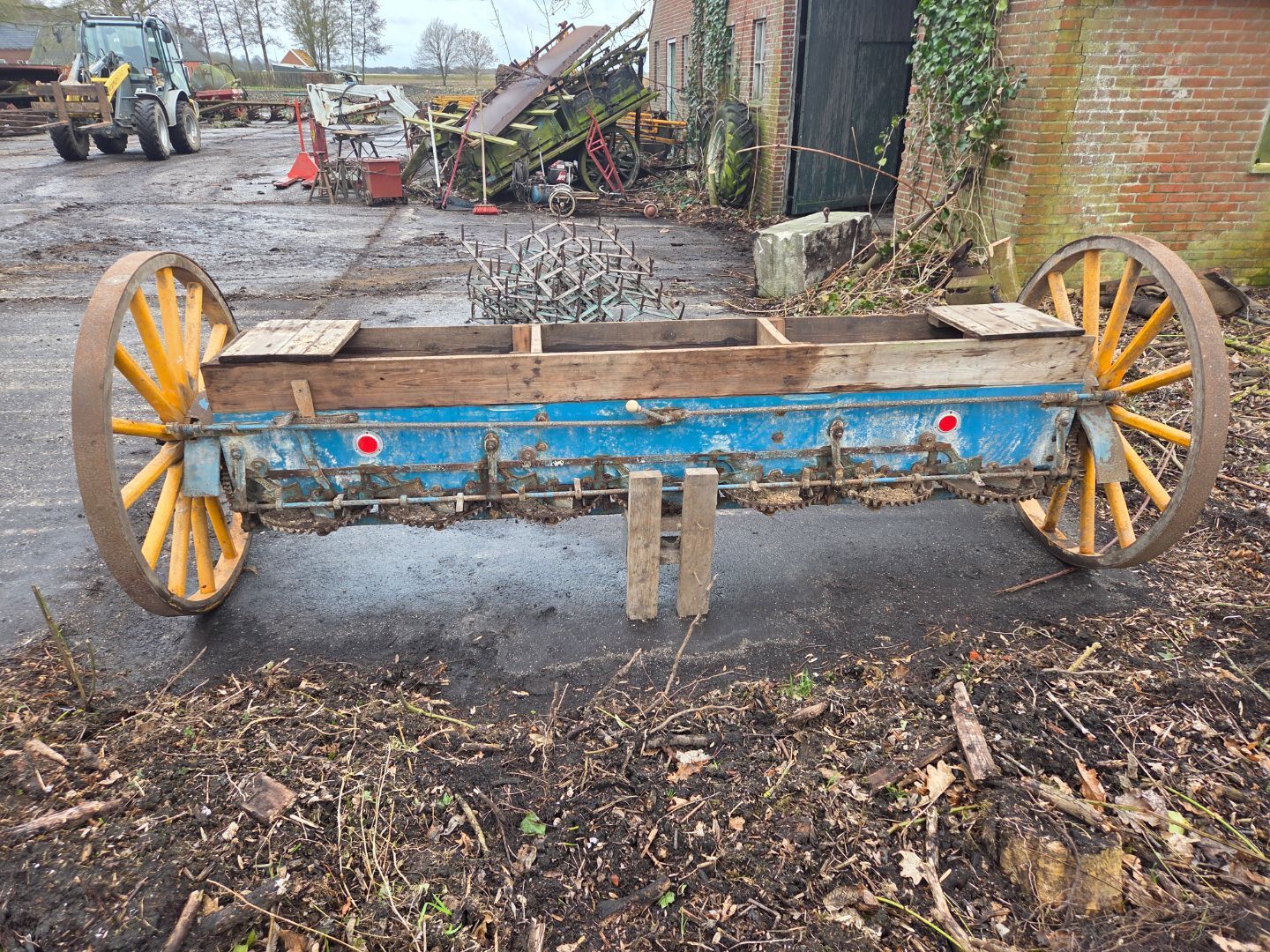 | Beschrijving: | Antieke schotelstrooier Uitgevoerd met houten spaakwielen 3 punts hef opname Zeer zeldzaam object |